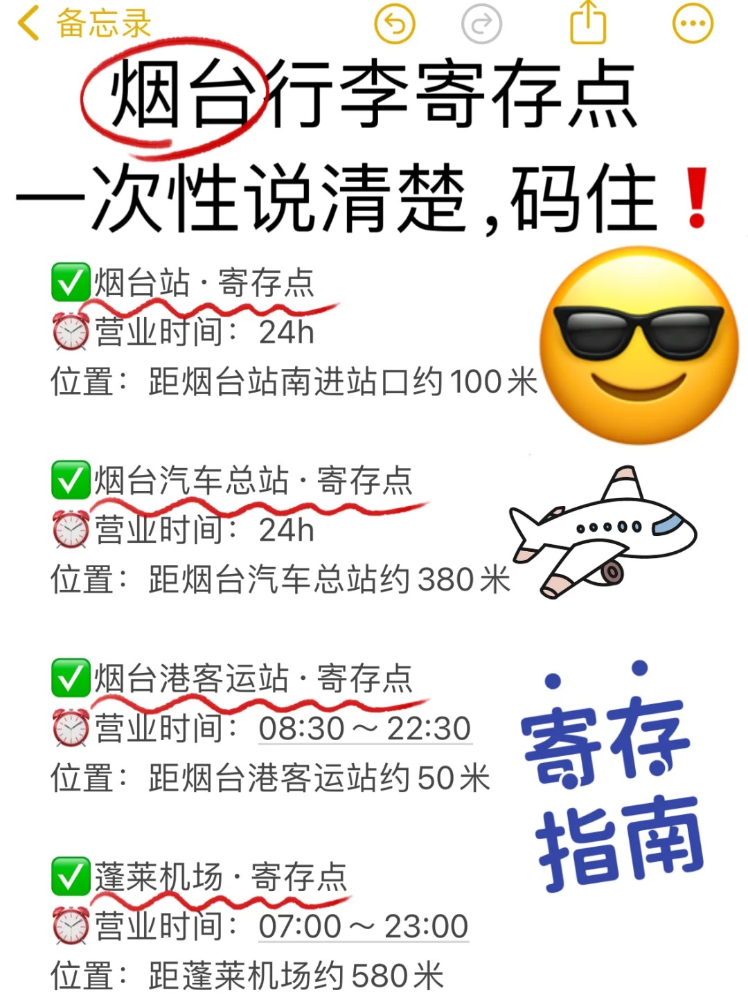 💖烟台在这些地方都可以寄存行李,可以在“途简单”小程序查询,烟台的车站、景区、商圈、地铁站附近都设有寄存点,共20多个寄存点呢~关键是只要5r就能存!