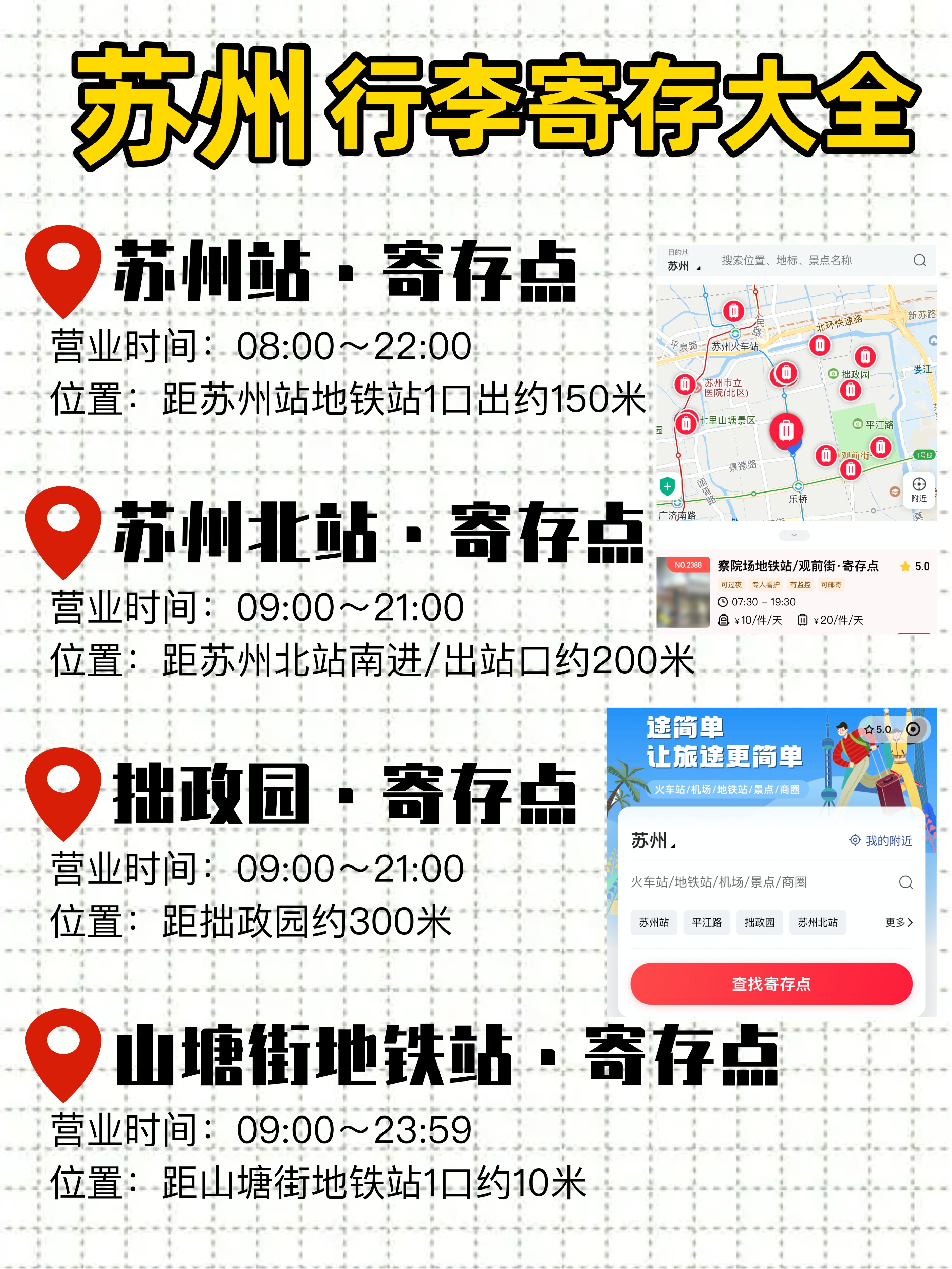 苏州有20多个寄存点,可在vx搜“途简单”小程序,在线查看/下单寄存。